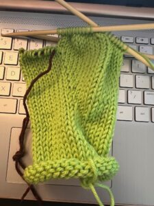 Knitting a bright green Nola mitten on a cozy fall morning.